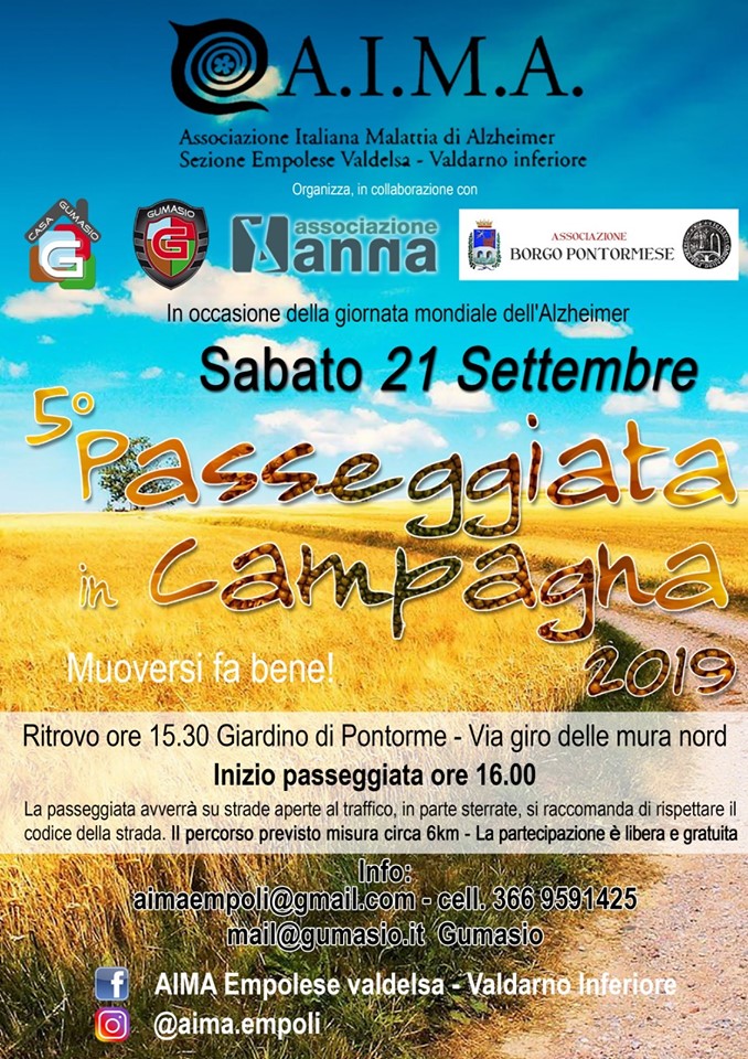 Anche quest’anno la Fondazione Chiarugi aderisce alla Passeggiata della salute in occasione del mese dell’Alzheimer, organizzata da AIMA sezione Empolese Valdelsa – Valdarno Inferiore, che si terrà sabato 21 settembre, con ritrovo alle 15.30 al Giardino di Pontorme a Empoli.