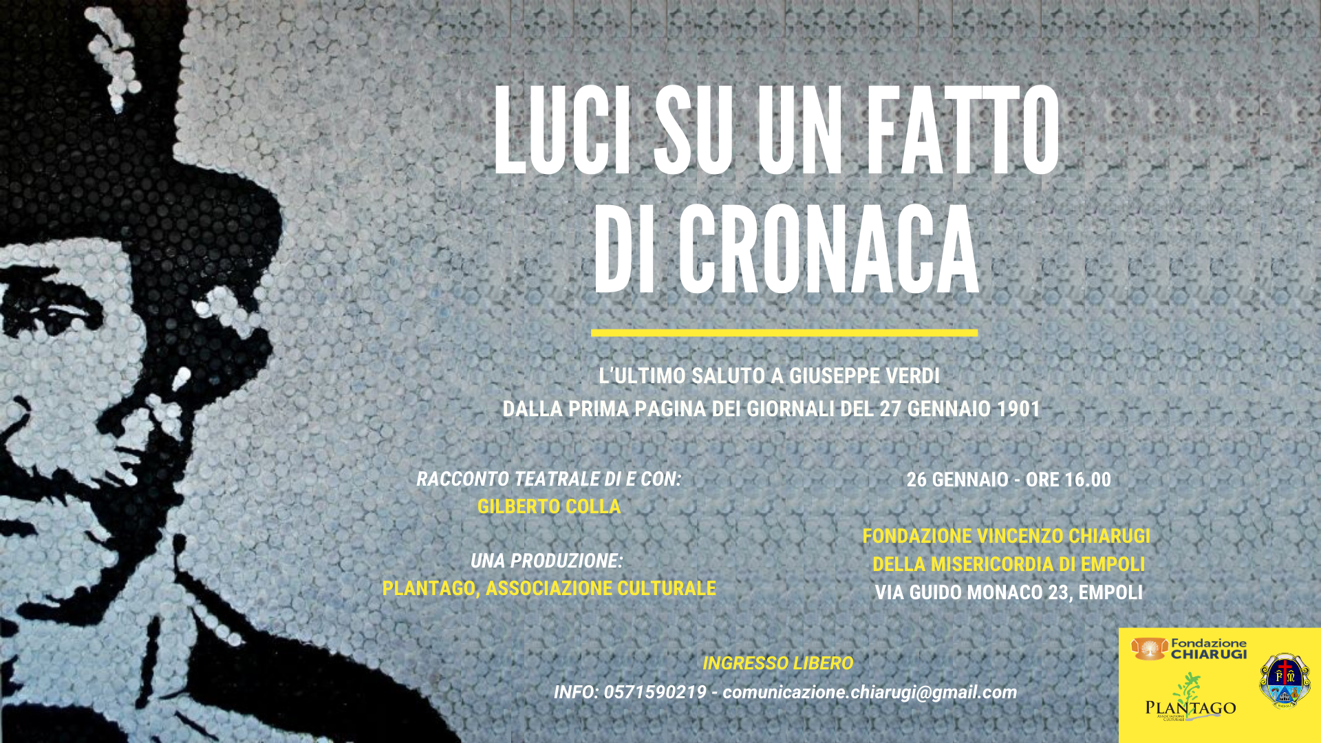 Alle 2.50 del 27 gennaio 1901, Giuseppe Verdi si spegneva in una camera dell’Hôtel Milan a Milano. Aveva 88 anni. La cronaca nelle pagine dei giornali e i pensieri di Verdi sull’arte, sulla musica, sulla vita, sono i protagonisti di questa “cronaca teatrale”. Un teatro che ricorda la trepidante attesa del mondo per la sorte del grande musicista. In scena Gilberto Colla, la musica del Maestro, brani tratti dalle sue opere, interpretati dai più grandi cantanti lirici del secolo scorso, ma anche le prime pagine dei più importanti quotidiani del tempo.
